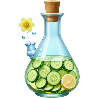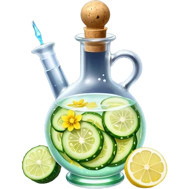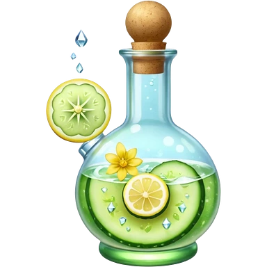 potion bottle with a perfectly round floating bottom, very small cork, very short neck, filled with #00d9ff liquid, inside cucumber slices, lemon slices, ice cubes, edible flower petals, and magical sparkles, soft lighting, transparent glass, clean background, fantasy style emoji