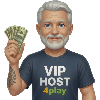 older man with tattoo on arm shirt says VIP HOST 4play holding money emoji