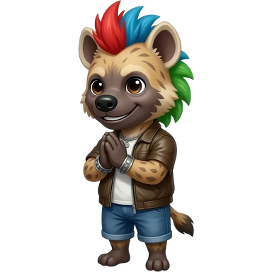 hyène punk cheveux rouge bleu vert qui prie avec le sourire emoji