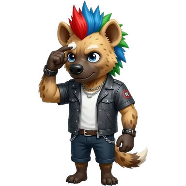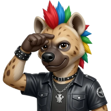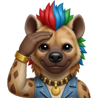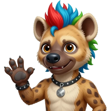 hyène punk cheveux rouge bleu et vert qui fait coucou avec sa pate emoji