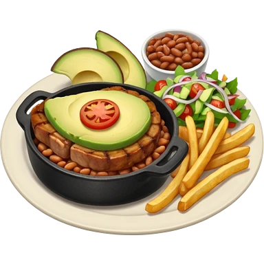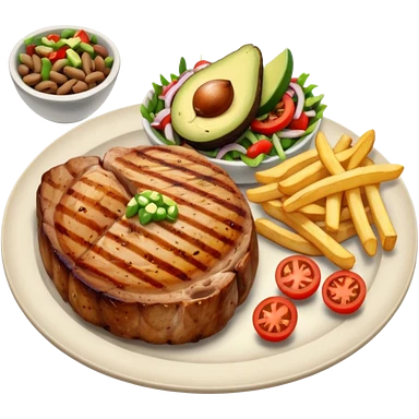 pork chops, fries, tomato onion salad, beans, and avocado emoji