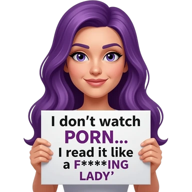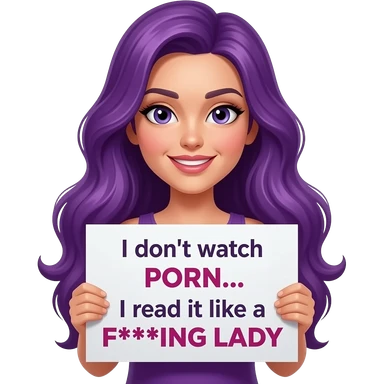 sexy girl with long purple hair holding a I don't watch PORN... I read it like a F***ING LADY sign emoji