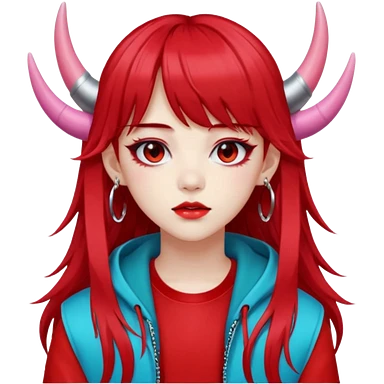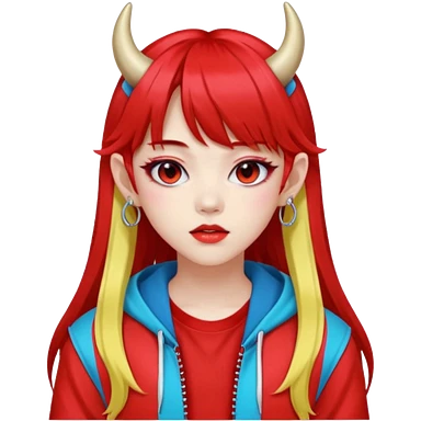 portrait-of-a-red devil-k-pop-idol,-wearing-a-stylish-streetwear-outfit-with-layered-colorful-clothing,-long-hair-with-bangs,-makeup,- emoji