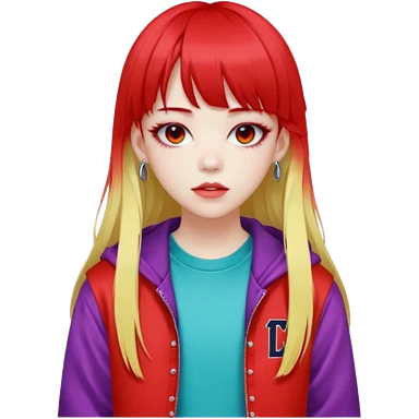 portrait of young woman idol in Kpop style, wearing flashy streetwear outfit, colorful dyed hair emoji