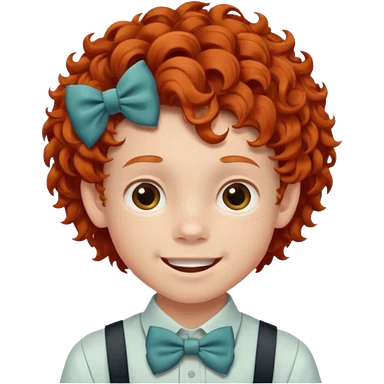 redhead kid with unique face features and very curly hair kid boy happy and braces on teeth, wearing a bow on head emoji