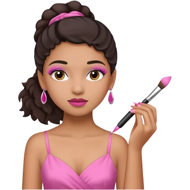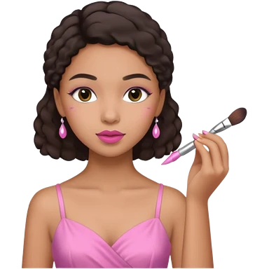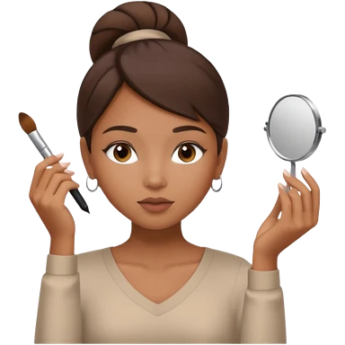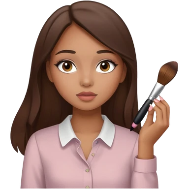 Draw a mixed-race girl applying makeup, wearing a clean girl blouse and with straight brown hair far away emoji