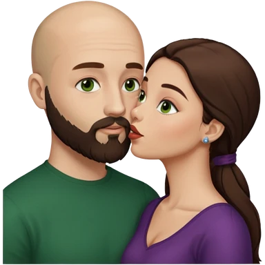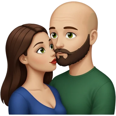 Man beard bald white dark green eyes, woman medium hair brown brown eyed latina kissing emoji