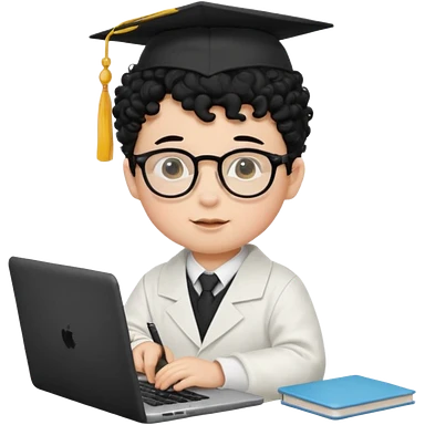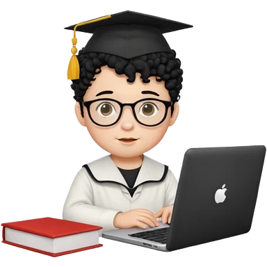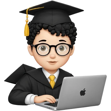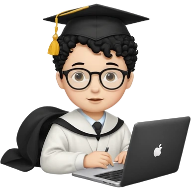 A baby boy DEVELOPER WITH A laptop, black curly hair and topknot, wearing glasses and a mortarboard emoji