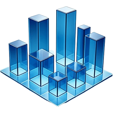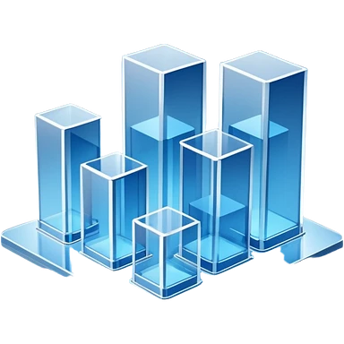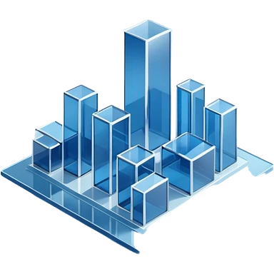 A minimalist 3D illustration of abstract glass buildings in blue tones, made of transparent glass-like materials with soft lighting and subtle reflections, isometric perspective, white background, futuristic architecture concept, volumetric light, clean render, high detail, no text emoji