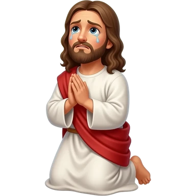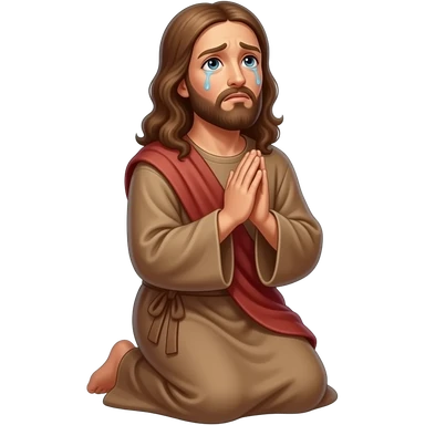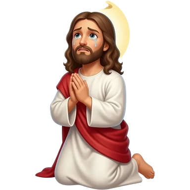 Jesus with a halo looking up worried with tears and praying on his knees to God emoji