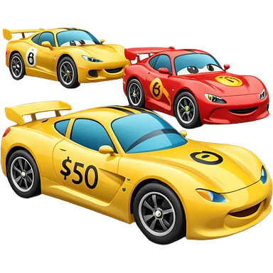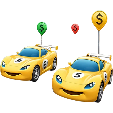 Two emoji-style cars racing toward a finish line labeled “$20K”, one labeled “$500/mo” and the other “$1000/mo”, energetic motion and speed lines emoji
