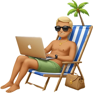 Emoji-style person relaxing on beach chair with laptop and money bag, “$20K” written in sand, sky gradient background, calm and successful tone emoji