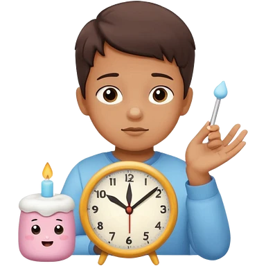 Emoji-style marshmallow test, child choosing between 1 marshmallow now and 2 later, clock above showing 15 minutes, cute lighting and pastel colors emoji
