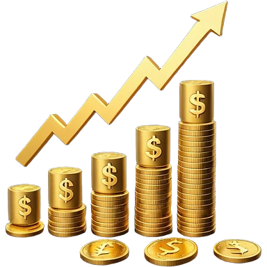 Emoji-style 3D illustration of a person climbing stairs made of money labeled “$10K” and “$20K”, with confetti and upward green arrows, bright optimistic lighting emoji