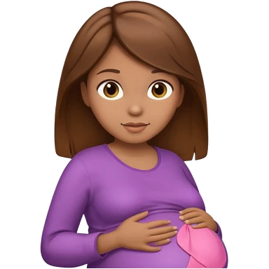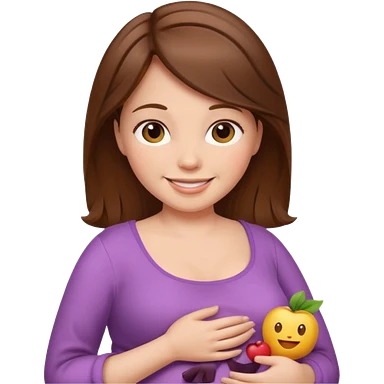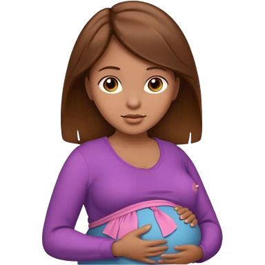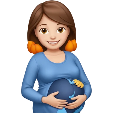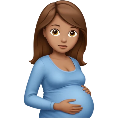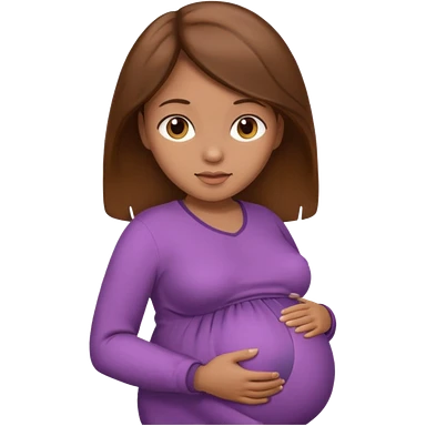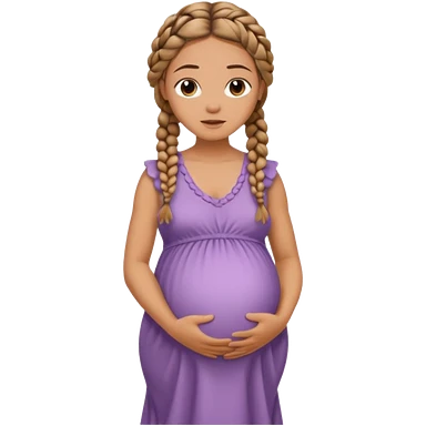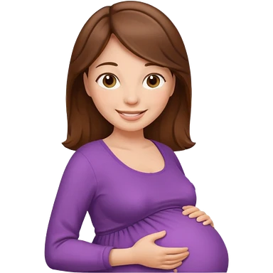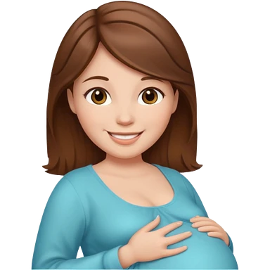 pregnant stylish woman with short pixie brunette hair happily touching her big belly while wearing white dress and fancy brown fur coat and colorful shades emoji