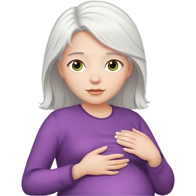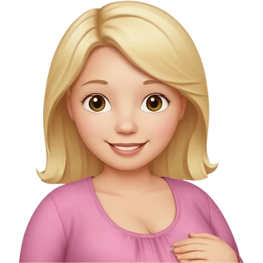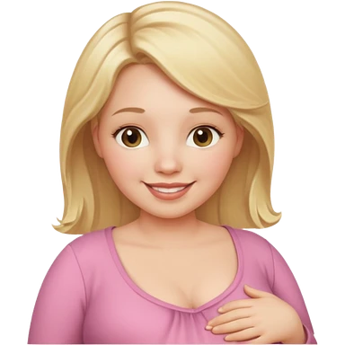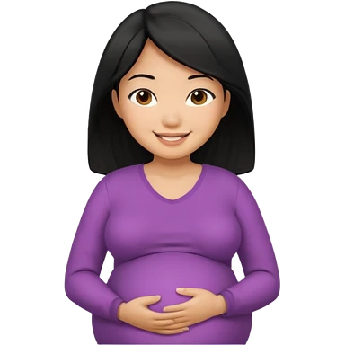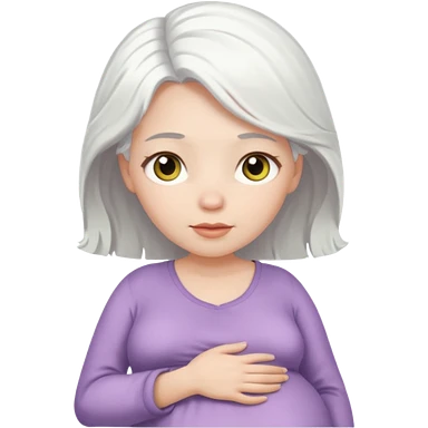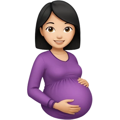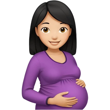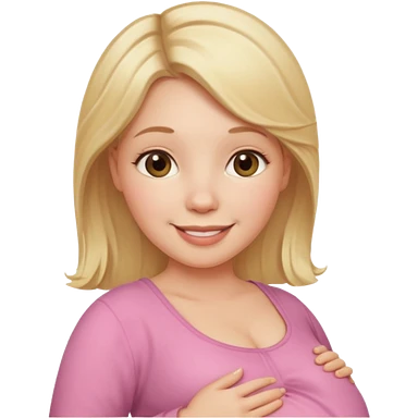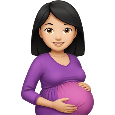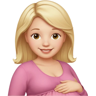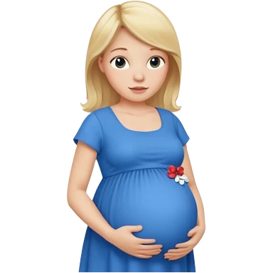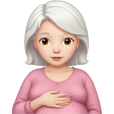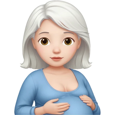 pregnant stylish woman with short pixie brunette hair happily touching her big belly while wearing white gown and fancy fur coat and colorful shades emoji
