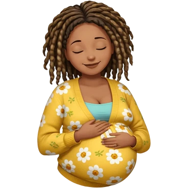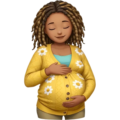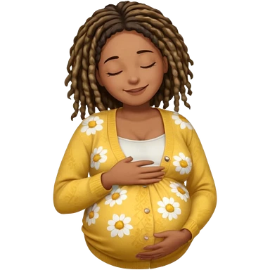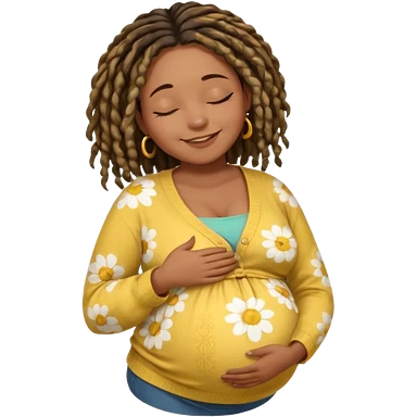 pregnant black woman with dread lock hair happily touching her big belly while wearing casual shirt and yellow warm flowery cardigan closing her eyes and smile wamrly emoji