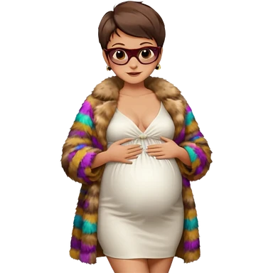 pregnant stylish woman with short pixie brunette hair happily touching her big belly while wearing white dress and fancy brown fur coat and colorful shades emoji