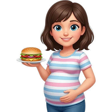 Pregnant woman with brown hair and brown eyes eating a cheeseburger emoji