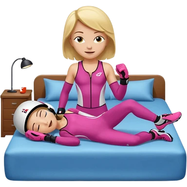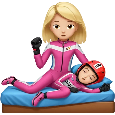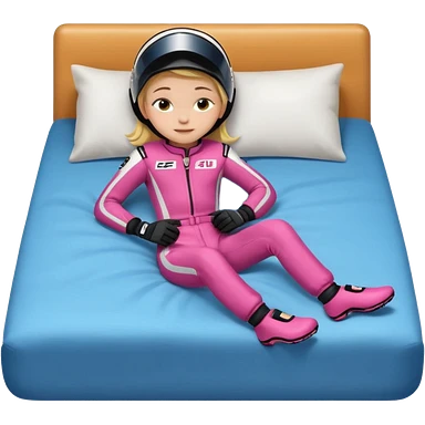 ten-year-old girl in a racing suit, racing shoes and racing gloves with no helmet, unzipped, sleeping on a bed happily, flat-chested and prepubescent emoji