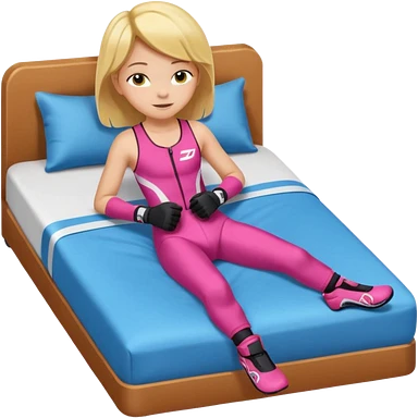 ten-year-old girl in a racing suit, racing shoes and racing gloves with no helmet, unzipped, revealing a sports bra, sleeping on a bed happily, flat-chested and prepubescent emoji
