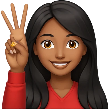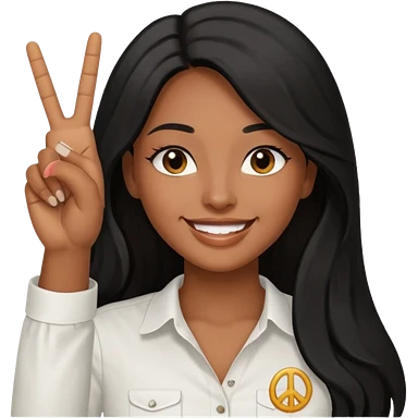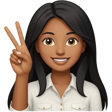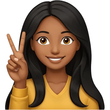 pretty brown skin woman with long black hair and brown eyes holding up the peace sign emoji