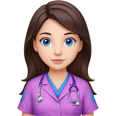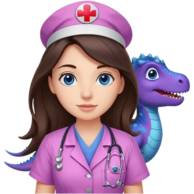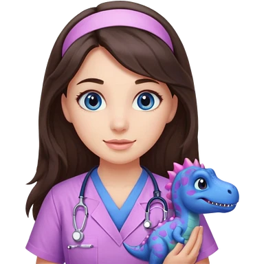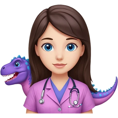 pretty brunette nurse with long hair and blue eyes in pink and purple dinosaur pattern scrubs emoji