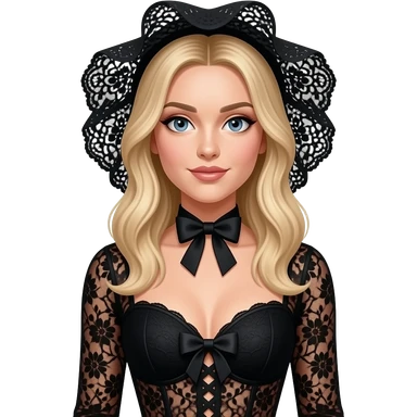 Sabrina Carpenter blonde wears a striking black lace bodysuit paired with an oversized, sculptural lace ruff that frames the head and shoulders like a dramatic fan. a satin sweetheart neckline and a central bow detail, transitioning into intricate floral lace throughout the torso. emoji