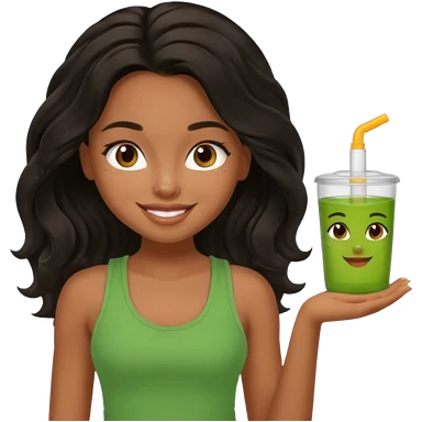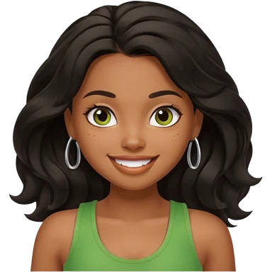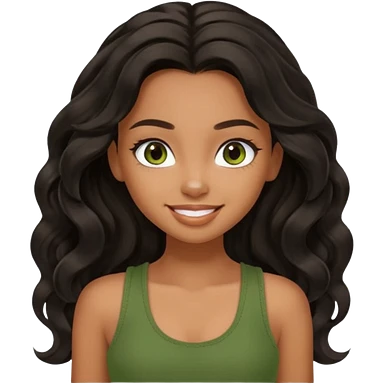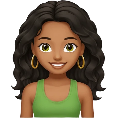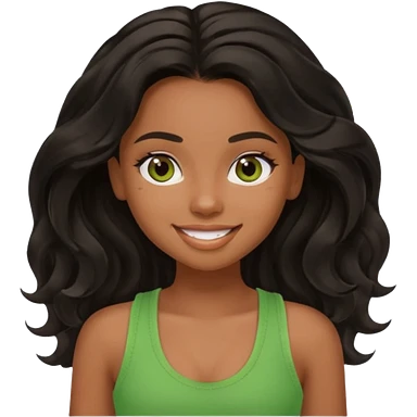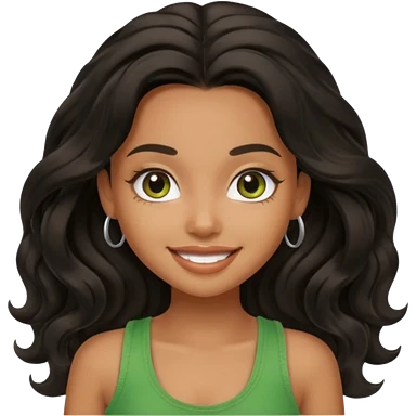 a pretty bratz brown girl with long wavy black color hair, brown eyes and green tank who is smiling emoji
