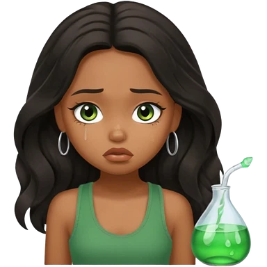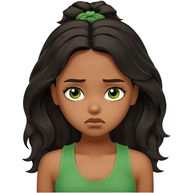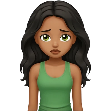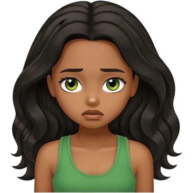 a pretty bratz brown girl with long wavy black color hair, brown eyes and green tank who is depressed and sad emoji