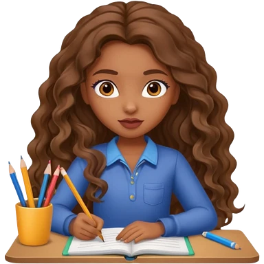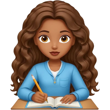 a pretty tan bratz girl with black wavy long hair studying. Pile of books on the table. No glasses emoji