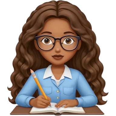 young women pharmacist studying science, wavy hair, with a pen and glasses emoji