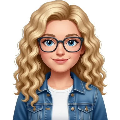 hyperrealist caucasian curly long blonde hair blue eyes squared glasses,white top jean jacket emoji
