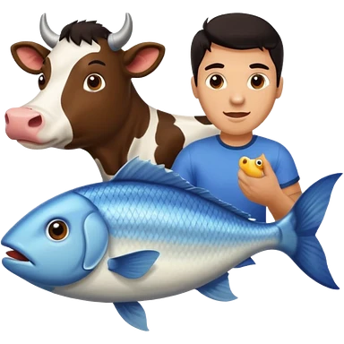 Guy with dark hair holding a fish getting chased by a cow emoji
