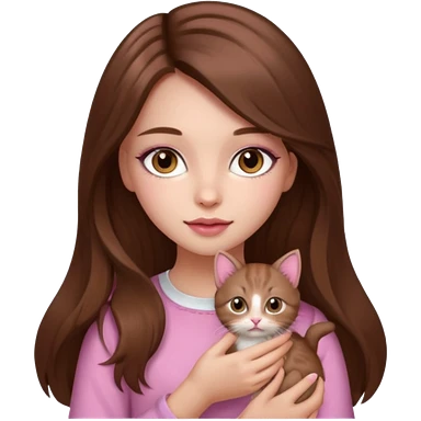 pretty girl with brown long hair and makeup, holding a black kitten, emoji style emoji