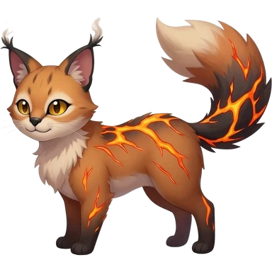 realistic ember-rust copper fur molten with glowing magma seams and smoky tips beautiful elegant pretty precious cute Fakémon-Pokémon-opossum-feline-serval-caracal-chinchilla-Furret-Minccino-hybrid-creature with a big fluffy bushy tail (full body) emoji