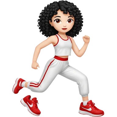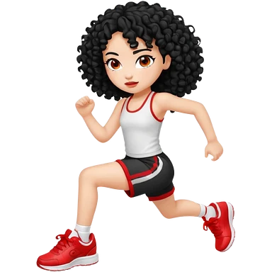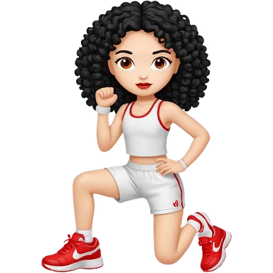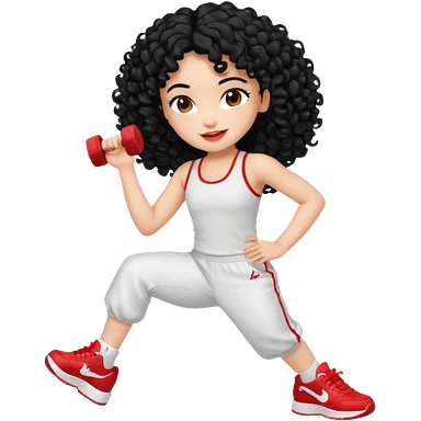 generate a pretty bratz fair skinned girl with curly black hair wearing a white gym set and excersing with red shoes on emoji