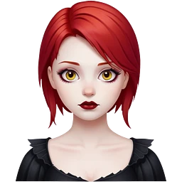 Vampire woman, white skin, pretty red eyes, half up half down black hair, two space buns on the top of her head emoji