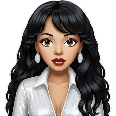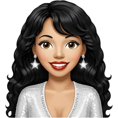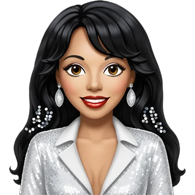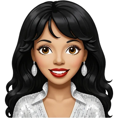 Donna Summer with long jet black hair, white sequin outfit emoji