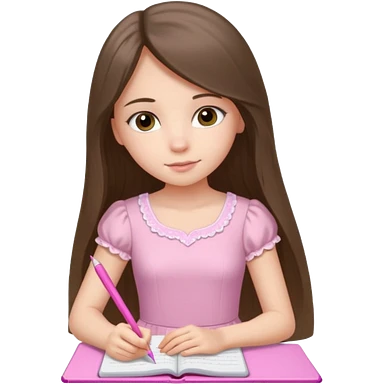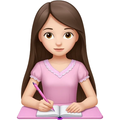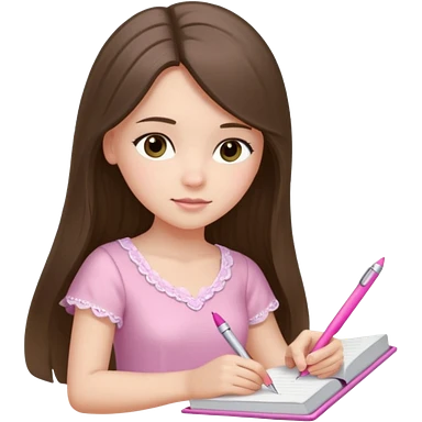 pretty white brunette teen long hair with hazel eyes in a light pink dress writing in a notebook with a pink pen emoji