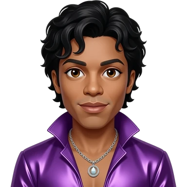 Prince Rogers Nelson with black hair, purple metallic shirt, purple metallic baggy pants, silver necklace emoji