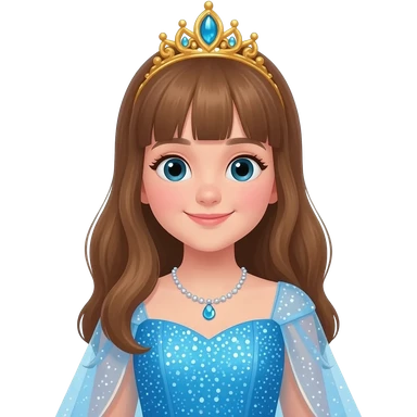 Princesa con cabello largo lacio con fleco castaño de ojos cafés con corona princesa tierna y sexy emoji | AI Emoji Generator