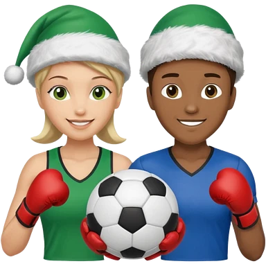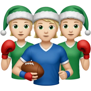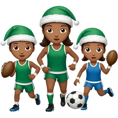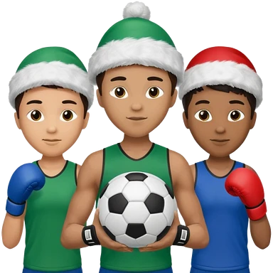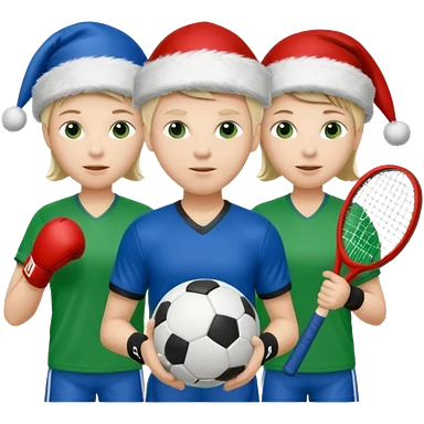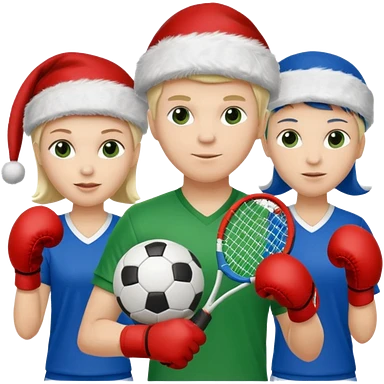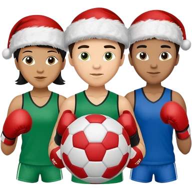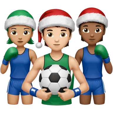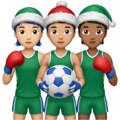 crie a imagem de 3 atletas de modalidades diferentes, usando elementos esportivos, como por exemplo bola de futebol, luvas de luta e bola de vôlei... e usando um chápeu de papai noel das cores verde e azul. emoji