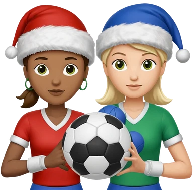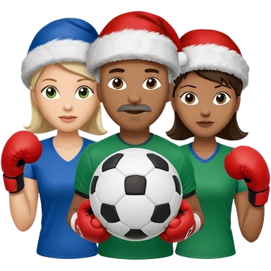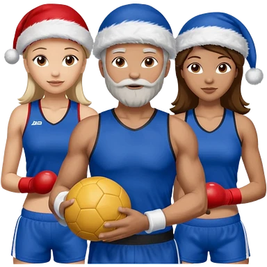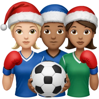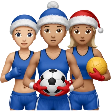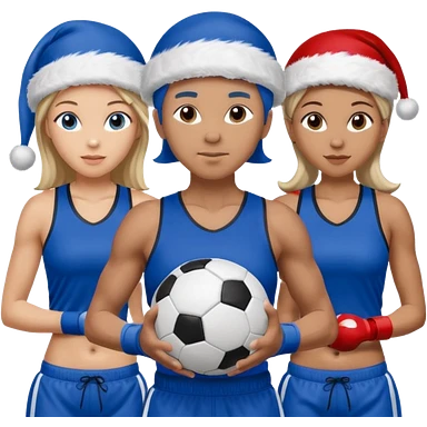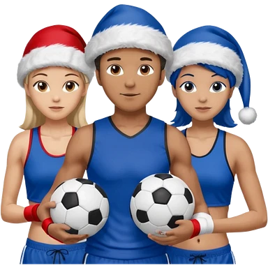 crie a imagem de 3 atletas, um homem no meio e duas mulheres, de modalidades esportivas diferentes, usando elementos esportivos, como por exemplo bola de futebol, luvas de luta e bola de vôlei... e usando um chápeu de papai noel das cores verde e azul. emoji