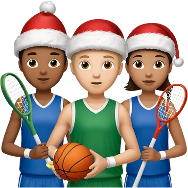 crie a imagem de 3 atletas de modalidades diferentes, usando elementos esportivos, como por exemplo bola, raquete, luca... e usando um chápeu de papai noel das cores verde e azul. emoji