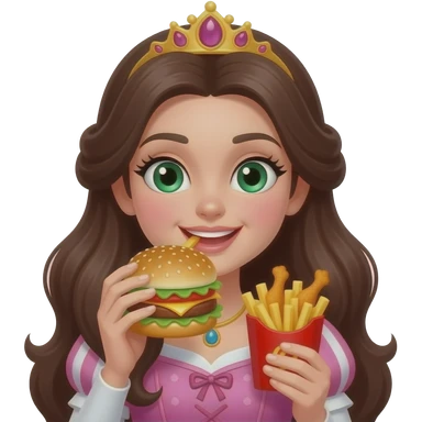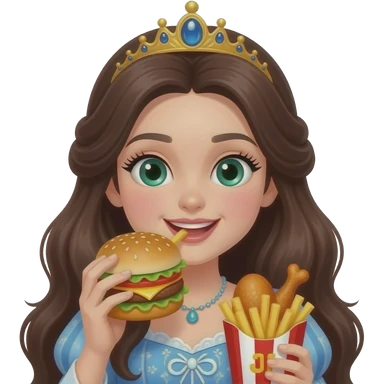 princess with long dark brown hair and green eyes with eyelashes eating burger and fries and chicken wings emoji