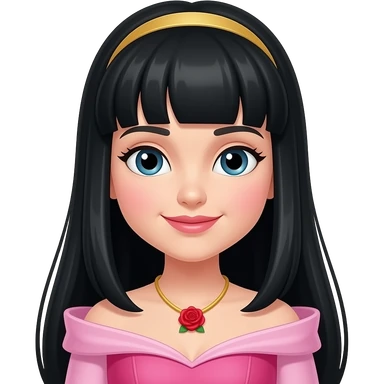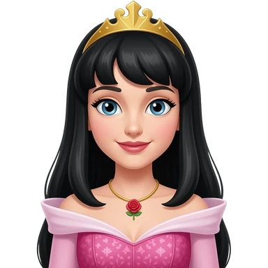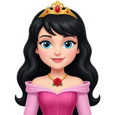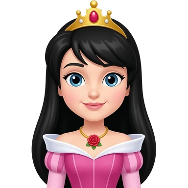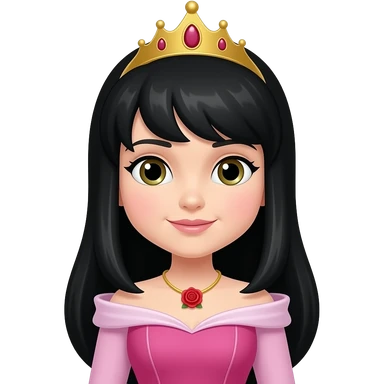 Princess Aurora but the hair is black. Then change the necklace into a red rose necklace the dress should be a pink one like sleeping beauty. Can you straighten the hair. And make the face a little rounder. Put a crown. Make the face a little nonchalant emoji