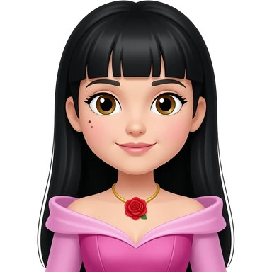 Princess Aurora but the hair is black. Then change the necklace into a red rose necklace the dress should be a pink one like sleeping beauty. Can you straighten the hair. And make the face a little rounder. With a mole on the left cheek near the ear emoji