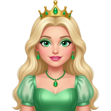 Princess Ozma from The Wonderful Wizard of Oz with green eyes, long platinum blonde hair, green eyeshadow, pink lipstick, light green metallic sweetheart sleeve dress, gold crown, green necklace and earrings emoji