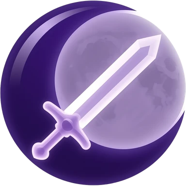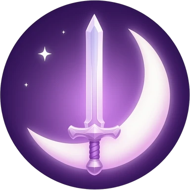 Glowing dark purple detailed crescent moon with an elegant detailed glowing transparent sword, emoji style. Soft violet and pink glow, minimal clean design, smooth edges, subtle lighting, centered, high contrast, transparent background. emoji